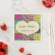 A cream coloured heart shape graphic with faux stitched border is set against a floral patchwork quilt background on these paper napkins that have a warm, colourful look and are perfect for boho style weddings. The heart shape is ready to be personalised with the names of the bride and groom and their wedding date.