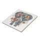 Scandinavian style meets Africa patterns in this unique elephant ceramic tile. The blue grey elephant with tusks faces you. He is decorated with rust orange flower designs, and additional flowers float about the design. His truck is filled with a boho stripe pattern.