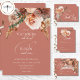 Elevate your wedding day with a touch of bohemian romance with our exquisite boho watercolor floral wedding invitation. At the pinnacle of elegance, a delicate spray of terracotta rust and soft peach blush mums, entwined with creamy peach blush roses and accented by verdant sage green eucalyptus and foliage, graces the top of this invitation. Against a serene terracotta rust backdrop, our creamy white text adds a timeless charm, inviting your guests to join in the celebration of your love story. This invitation effortlessly captures the essence of boho chic, setting the stage for a day filled with warmth, joy, and unforgettable moments. Let the beauty of nature intertwine with the elegance of your union, starting with the perfect invitation that speaks to your unique style and vision. Choose our boho watercolor floral wedding design and embark on a journey to a day as enchanting as your love. Created by Simply Farmhouse Press.