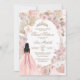 Birthday invitation in an elegant boho style. Blush pink and white roses, dried floral, palm and pampas grass and a girl in a beautiful matching gown.
