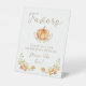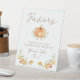 Celebrate your soon-to-be fall baby with your friends and family to share in the joy of your little one's arrival with this baby shower favours please take one pedestal sign featuring a watercolor pumpkin and fall foliage.