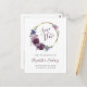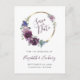 This boho save the date postcard features a purple watercolor floral wreath on a gold circular frame. Customise the elegant purple handwriting script with the names of the bride and groom, and the charcoal grey sans serif text with the date and location. Add your return address to the back.