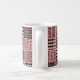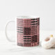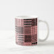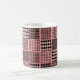 This mug has a Boho design of squares with patterns in each in black and pink.