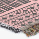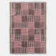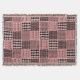 This throw blanket has a Boho design of squares with patterns in each in black and pink.