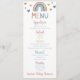This is a boho rainbow themed baby shower menu. The design consists of a boho rainbow theme with yellow, blue, red, pink, and green colours and hearts.
