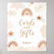 This Baby Shower Cards and Gifts sign is part of the Boho Rainbow baby shower collection chraacterised by cute rainbow graphics and neutral colours that is suitable for boy and girl, or gender-neutral baby shower. This sign is easy to match with your colours.