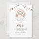 A modern and chic first birthday invitation with rainbow and banderitas design in pastel colour for a boho fiesta theme.