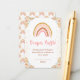 This cute and whimsical baby shower diaper raffle features a boho rainbow, confetti and floral arrangements with pampas grass in beige, pink and brown neutral tones. The text combines handwritten script and sans serif fonts for a stylish and modern look. This is perfect for a spring or summer baby shower.