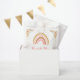 This cute and whimsical baby shower favour bag features a boho rainbow, confetti and floral arrangements with pampas grass in beige, pink and brown neutral tones. The text combines handwritten script and sans serif fonts for a stylish and modern look. This is perfect for a spring or summer baby shower.