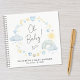 Cute baby boy shower guest book notebook featuring pastel blue and yellow watercolors of a boho rainbow, sun, hearts, stars, moons and clouds and "Oh Baby!" in a stylish calligraphy script. Personalise the mother-to-be's name and the shower date in simple modern typography.