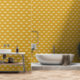 Boho rainbows pattern, cream on mustard background, peel and stick wallpaper.