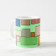 This mug has a boho modern design of rectangles attached to horizontal lines in various sizes and boho colours.