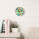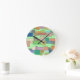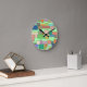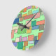 This wall clock has a boho modern design of rectangles attached to horizontal lines in various sizes and boho colors.