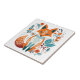 On this ceramic tile, a beautiful orange red fox with blue eyes gazes out. The fox has boho style pattern embellishment in blue. The image is placed on a white background, with matching flower and leaf decorations surrounding it.