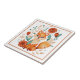 This pretty ceramic tile features a boho style red fox that is surrounded by rusty orange flowers and teal blue leaves. The image is placed on a white background and framed with a matching thin border line.