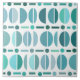 A vintage style mid century modern pattern with geometric bowls shapes, dots and lines. Shades of blue-green and white.
