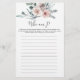Boho rose themed baby shower who am I game card features a watercolor pink rose illustration and watercolor greenery eucalyptus garland and elegant handwritten style font.