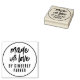 Made with love wooden stamps featuring a circular frame, "made with love" in brushed script lettering, with the "i" in "with" dotted with a tiny heart. Below, your name appears in bold rustic capitals. The name appears over two lines and can be changed to feature a shorter name or a business name. Perfect for artists, makers, bakers, and small businesses! This wooden stamp can be used on business cards, thank you notes, boxes, wrapping paper, tags, canvas, and more! This is the wooden rubber stamp - choose the handle and ink pad options according to your preference! A self-inking version of this stamp is available in my store.