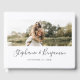 A lovely custom photo boho wedding guest book featuring a single horizontal photo of the bride and groom on a white background. The couple's names appear in whimsical dark grey handwriting script, with the date below in classic grey serif font. Matching grey serif text appears on the spine.