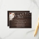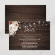 Boho wedding details information card features neutral flowers, dried palm leaves and string lights on wood.