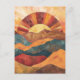 This boho sunset artwork postcard features layered mountains in warm earthy tones of orange, red, and gold, with a radiant sunburst shining above the peaks. The retro-inspired design blends rustic textures with modern bohemian style, creating a bold yet calming landscape aesthetic. Perfect for nature lovers and free spirits, this design adds warmth and character to any space. A great gift idea for birthdays, housewarmings, and seasonal occasions, especially for those who love outdoor adventures, hiking, or boho-inspired decor.