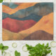 This boho sunset artwork kitchen towel features layered mountains in warm earthy tones of orange, red, and gold, with a radiant sunburst shining above the peaks. The retro-inspired design blends rustic textures with modern bohemian style, creating a bold yet calming landscape aesthetic. Perfect for nature lovers and free spirits, this design adds warmth and character to any space. A great gift idea for birthdays, housewarmings, and seasonal occasions, especially for those who love outdoor adventures, hiking, or boho-inspired decor.