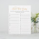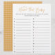 Boho script "Name That Baby" graphic in rustic yellow with line art sun detail, baby shower game sheet with matching rustic yellow pattern backing.