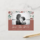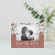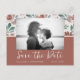 Modern and boho save the Date wedding announcement card, featuring chic lettering and your couples photo. Around the photo is an elegant floral pattern featuring watercolor flowers and foliage and a solid terracotta colour at the bottom. Original artwork in watercolor created in our studio. Easy to edit with your own details.