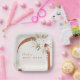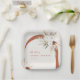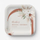 Bohemian Floral Arch, paper plates. Boho style watercolor flowers, pampas grass and delicate green foliage frame with beige and terracotta orange arch shapes.
