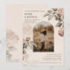 This wedding invitation features a soft, romantic vintage botanical style with subtle boho and rustic influences. The design showcases delicate, engraved-style florals in muted terracotta, sage, and warm taupe tones set against a faux textured parchment background, giving it an heirloom, old-world feel. An arched photo frame in the center adds a modern yet timeless architectural element, blending classic elegance with relaxed countryside charm. The earthy color palette, natural foliage details, and organic layout lean toward boho-rustic, while the refined typography and structured composition keep it polished and sophisticated rather than overly casual.