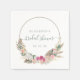 This boho design features the words "bridal shower" in elegant sage green handwriting script with flourishes at the beginning and end, framed by a hoop decorated with a tropical watercolor bouquet of pink, blush and white flowers, dried palm leaves and eucalyptus foliage. Personalize the text with the name of the bride-to-be and the date of the shower.