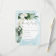 This wedding response card design features beautiful, lush tropic greenery and white florals on a soft Caribbean aqua blue watercolor background. Perfect for the destination or beach wedding. Created by Simply Farmhouse Press.