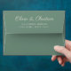 Modern wedding envelopes invitation design featuring dusty pink watercolor flowers and tropical leaves on a sage green background. Envelope flap is customisable with return address.