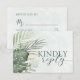 Complete your destination wedding suite with this elegant tropical RSVP card, featuring original watercolor monstera leaves, lush palm fronds, and vibrant botanical greenery. Designed for beach, island, or coastal celebrations, this fresh and modern layout beautifully complements tropical, boho, or summer wedding themes. With space to personalise your reply details, meal selections, or special notes, this card helps your guests respond with ease. A stylish and cohesive addition to your exotic wedding stationery set.