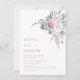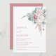 This elegant contemporary wedding invitation features watercolor painted blush boho roses flowers and greenery on a white background.