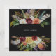 This stylish wedding invitation features trendy watercolor flowers in shades of burgundy, marsala, orange, yellow, and white along with boho feathers and lots of green leaves on a dark, black background.
