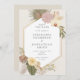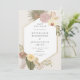 This invitation has bohemian inspired watercolor features, including pampas grass, orchids, palm leaves, anthurium and protea flowers in a neutral palette. It has a white hexagon with a simulated gold frame. The background behind the shape can be changed, or deleted if you want white. The copy is editable and the font can be changed. The card has a coloured background, a little darker than the front. You can change the back colour.