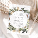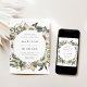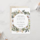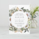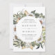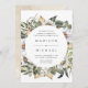 Elegant, unique floral wedding invitation featuring your wedding details encircled by white watercolor flowers and lush foliage in rich green, beige, and brown earth tones. The invite reverses to a light beige watercolor background.