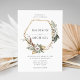 Elegant, unique floral wedding invitation featuring your names inside of a faux gold foil geometric frame adorned with white watercolor flowers and lush foliage in rich green, beige, and brown earth tones. Personalise the floral invitations by adding details such as wedding date, time, venue, and reception information. The invite reverses to a light beige watercolor background.