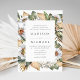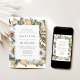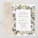 Elegant, unique white floral wedding invitation featuring your wedding details framed by white watercolor flowers and lush foliage in rich green, beige, and brown earth tones. The invite reverses to a light beige watercolor background.