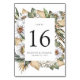 Elegant, tropical floral wedding table number cards featuring white watercolor flowers and lush foliage in rich green and brown earth tones. Personalise by adding the table number, your names, wedding date, etc. Design repeats on reverse side. Coordinates with our Boho White Floral & Greenery wedding invitation suite.