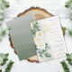 Elegant and classy boho-chic white rose and eucalyptus floral "Bridal Shower" real gold foil script text design with dark gold-toned confetti and shadowing. Name is also in real gold foil. Back features a watercolor gradient sage green background with green and sparse dark gold-toned confetti splatters.