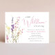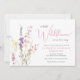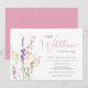 A whimsical baby girl shower invitation featuring "a little wildflower is on her way" written in a blend of modern grey typography and an elegant pink calligraphy script, and a boho-inspired watercolor bouquet of dainty purple, pink and yellow wildflowers.