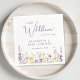 Elegant baby girl shower napkins featuring "a little wildflower is on her way" written in a mix of light grey typography and a stylish purple script, and boho-inspired whimsical watercolors of dainty purple, pink and yellow wildflowers. Add the name of the mother-to-be in simple purple lettering.