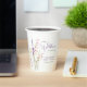 Elegant paper cups for your baby girl shower that feature "a little wildflower is on her way" showcased in a blend of light grey typography and a whimsical purple script, and a boho-inspired watercolor bouquet of pink, purple, and yellow wildflowers.