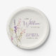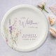 Elegant light cream baby girl shower paper plates featuring "a little wildflower is on her way" showcased in a blend of modern grey typography and a whimsical lavender purple script, and a boho-inspired watercolor bouquet of purple, pink and yellow wildflowers.