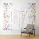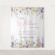 An elegant baby girl shower welcome tapestry and photo backdrop featuring "a little wildflower is on her way" in a blend of light grey typography and a stylish pink script, and boho-inspired whimsical watercolors of dainty purple, pink and yellow wildflowers. Add the name of the mother-to-be in simple pink lettering.
