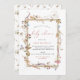 A pretty wildflower baby shower invitation featuring a gold frame with watercolor wildflowers and coral modern calligraphy font. The reverse features has a pattern of watercolor wildflowers.
