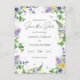 This is a bohemian and simple wedding save the date invitation postcard. The design features a floral border or frame using variety of spring wildflowers including yellow daffodils, purple pansies, clovers, lavender, sweetpeas, dandelions, tulips and fern and ivy greenery. It also includes a few ladybirds, a sweet dragonfly and space for your own message.