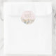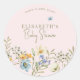 Delicate wildflowers meadow bouquet with pastel watercolor floral blooms elegant chic spring or summer garden girl baby in bloom shower personalised sticker with whimsical elegant modern calligraphy script over a blush pink background.